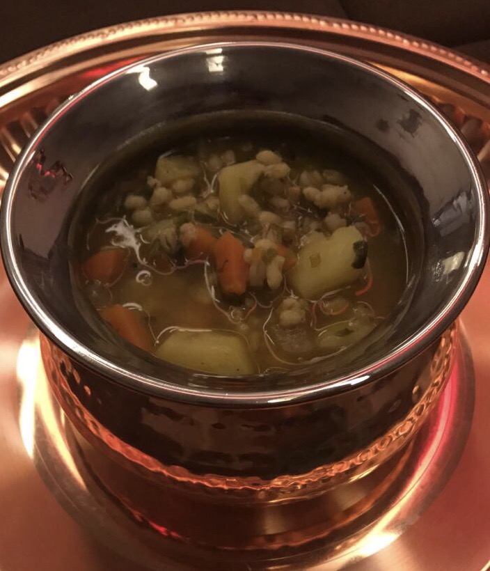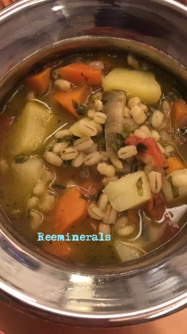 ٢- في قدر على النار توضع ملعقة من زيت جوز الهند ، ويصاف البصل والثوم ويقلب، ثم الخضار المقطعة ويقلبوا لمدة 3 دقائق ثم يضاف الشعير ثم تضاف البهارات ثم الماء.