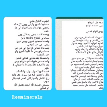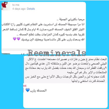 “السلام عليكم دكتورة قررت اكتب لج سالفتي ومعاها نتيجه برنامجج .من سنتين حاشتني حاله ان صارت لي سالفه قوية وتميت افكر فيها وايد و بيوم وليله تبدل حالي لي حال طول الوقت احس اني شادة اعصابي ومتشنجه وريولي ترجف وماقدر اقعد مع الناس احس بدوخه توتر كبير مخنوقه دوامي ماقدر اروح له لاني اتم ارجف بالليل اتخيل اشياء واخاف وانام وانا ارجف من التوتر وصدمتي بحالتي ووضعي وجهلي للي يصير زادتي كأبه ان شفيني شسالفه ليش جذي . طبعا على طول امسكوني ناس قالولي مسحورة وممسوسه وروحي حق شيخ ورحت وقرا علي 5 مرات مع زيت وعسل وتميت على برنامج شهرين وحالتي تسوء وكأبه وافكار جدا جدا سلبيه . قررت اتجهه حق الاماكن النفسيه ومن ثم المستشفيات . المستشفيات قالولي يمكن ام اس يمكن التهابات يمكن اذونج يمكن دمج . لكن مالي علاج لانه مجرد اشتباه فقط . طيب والدوخه والشد والتوتر والخوف من الناس ابي له علاج بس ماحصلت وقتها قالي دكتور بالهادي :يابنتي انتي راح ترجعين لي وتاخذين حبوب الاكتأب انا انصدمت من كلامه ليش جذي يقولي! . اتجهت للاماكن النفسيه اللي تعالج بكل الطرق سواء ايحاءات بالاحجار بتقنيه الحريه النفسيه الeft tft تأملات خفيت ولكن بنسبه 30%فقط الاعراض موجودة وتييني بين فتره وفتره لما شفت اكاونتج وخذيت موعد على طول وسويت التحليل وقلتيلي عندج زنك عالي فيج اكتأب؟ قلت لج اي ..طبعا وكالسيوم عالي والنقص بالباقي اتبعت برنامجج من 5 شهور مع العلم بهال5 شهور وللامانه ماكنت ملتزومه100%يعني كليت جبن يمكن مرتين ودجاج مره كانو عن خاطري ساعات بالغلط اطلب شي يكون في فلفل واكله ساعات اشرب قهوة فيها حليب لكن النتيجه اقدر اقولج الحين ان حياتي رجعت لي مثل اول دوامي ملتزمه فيه وبكل نششاط وبكل كشختي وراحتي وثقتي الخوف من الناس راح صرت اهداااا حيل شخصيتي تغيرت احس صارت فيني انوثه شوي الافكار الجنسيه راحت مني والسلبيه خفت بنسبه 70% بالنهايه احنا بشر والافكار تيينا لكن خفت حيييييييييل شي مايذكر يعني ومناعي صارت اقوى حيل حيل . بشرتي صارت احلى نومي مريييح دورتي خف اللمها .الدوخه راحت ولازلت مستمره لاني ناطره نتائج اكثر وااكثر باذن الله يارب افيد بهالتجربه ناس محتاجه والله يضيق خلقي لمااشوف ناس تتريق وتتغدا ووتعشى من برا احس داخلهم كومه ضياع مو حاسين فيها .. الله يوفقج حبيبتي ويسعدج الفضل لله سبحان اللي دلاني عليج ثم لج ولمساعدتج وطولة بالج”