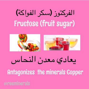 الفركتوز (سكر الفواكة) يعادي النحاس في حاله استخدامه كمحلى مركز ويضاف للحلويات والمشروبات الغازية والعصائر المعلبه واغلب المشروبات الملونة …